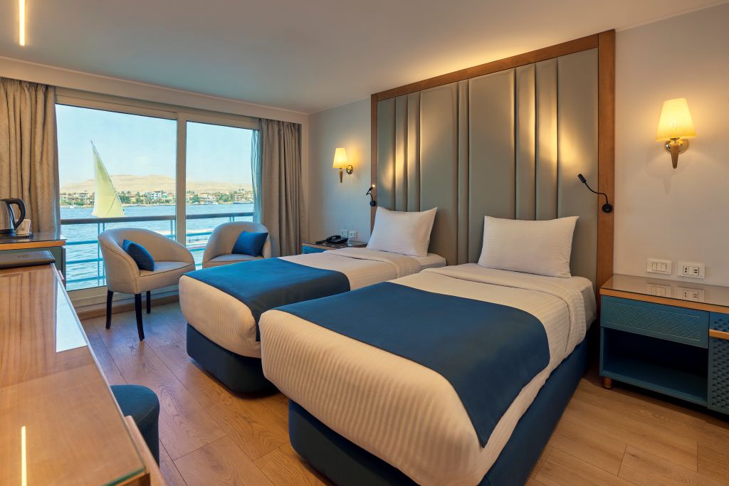 Az MS Royal Ruby Nile 5* hajó kiváló szolgáltatásokat és szállást kínál, amelyek egy csodálatos nílusi körutazást tesznek lehetővé. Hajózás kényelmesen és stílusosan az MS Royal Ruby Nile Cruise fedélzetén. Attól a pillanattól kezdve, hogy felszáll a fedélzetre, a tapasztalt és barátságos személyzet gondoskodik arról, hogy hajóútja emlékezetes legyen. Pihenjen a nagy napozóteraszon, és élvezze a folyamatosan mozgó tájat, vagy igyon egy italt a Panorama bárban egy városnézés után. Helyezze magát kényelembe a 71 légkondicionált szoba egyikében, melyekben minibár és LCD-televízió található. Kábeltelevízió gondoskodik a szórakozásról. A privát, zuhanyzós fürdőszobákban ingyenes pipereszett és hajszárító található. A kényelmi felszerelések közé tartozik a telefon, valamint a széf és az ingyenes palackozott víz.